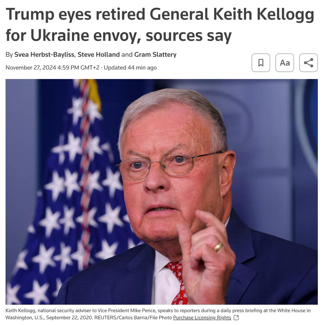 Избранный президент США Дональд Трамп может назначить специальным представителем по Украине 80-летнего Кита Келлога, отставного генерал-лейтенанта, который представил ему план прекращения войны.
