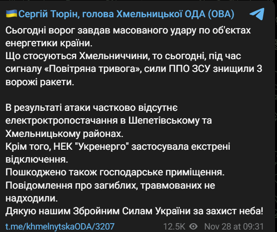 В Хмельницкой области экстренные отключения света после атаки по энергетике, сообщает глава ОВА Сергей Тюрин.