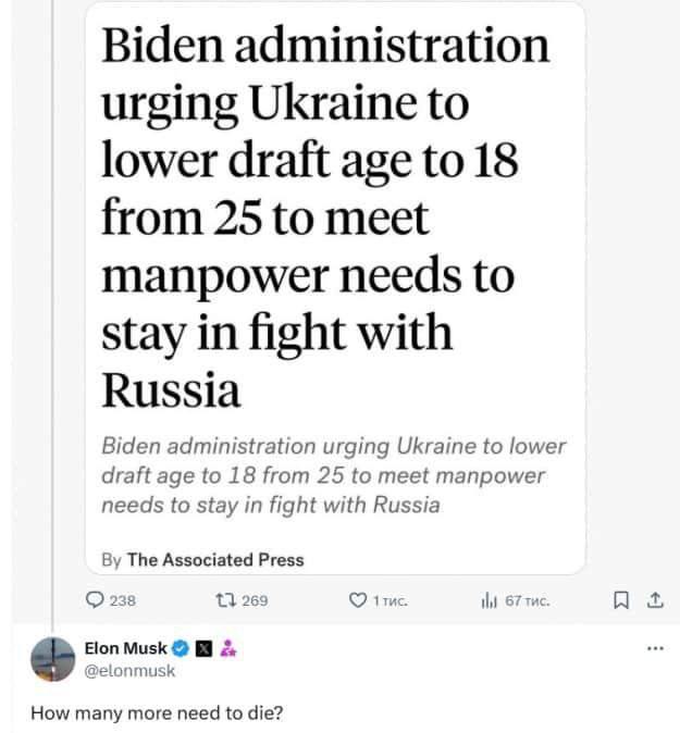 Илон Маск раскритиковал призывы администрации Джо Байдена к Украине снизить возраст мобилизации до 18 лет.