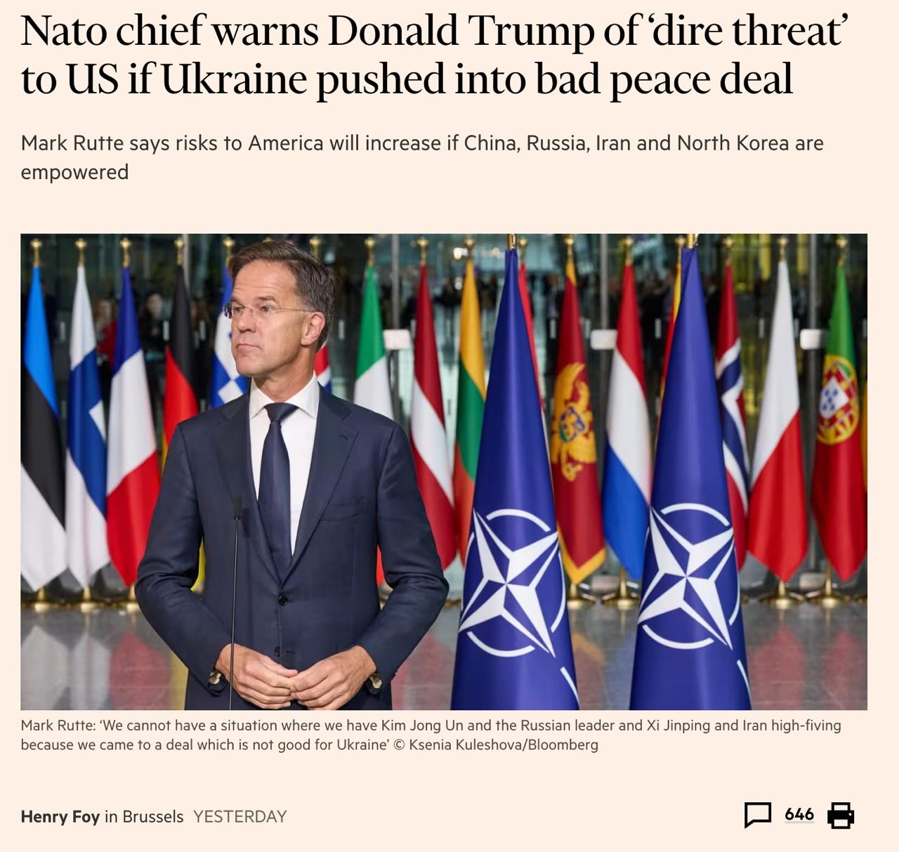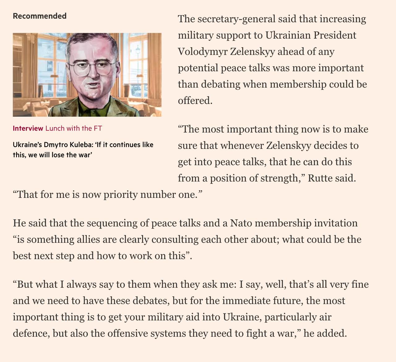 Тем временем генсек НАТО Марк Рютте заявил, что тема членства Украины сейчас второстепенная, передает Financial Times.