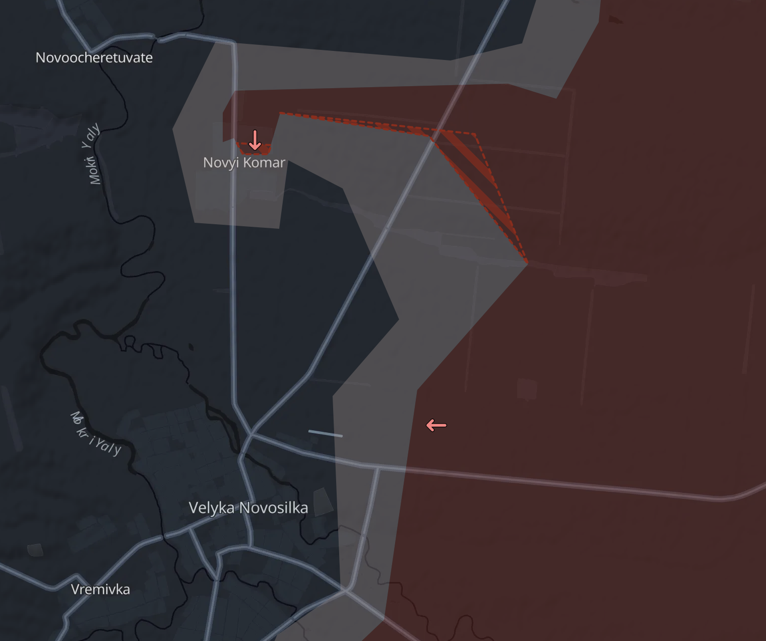 Под Великой Новоселкой россияне продолжают бои за деревню Новый Комар, которая блокирует город с севера. Согласно карте Deep State, они нарастили свое присутствие в селе и к востоку от него.