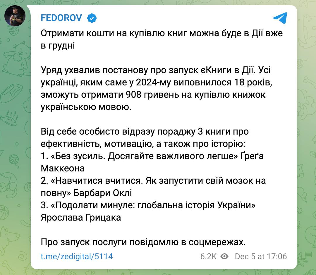 "Правительство приняло постановление о запуске "еКниги" в "Дие". Все украинцы, которым именно в 2024-м исполнилось 18 лет, смогут получить 908 гривен на покупку книг на украинском языке", - написал министр.