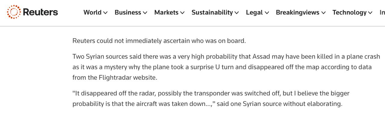 "Два сирийских источника сообщили, что существует очень высокая вероятность того, что Асад мог погибнуть в авиакатастрофе, так как, согласно данным с веб-сайта Flightradar, было загадкой, почему самолет неожиданно развернулся и исчез с карты", - говорится в статье.