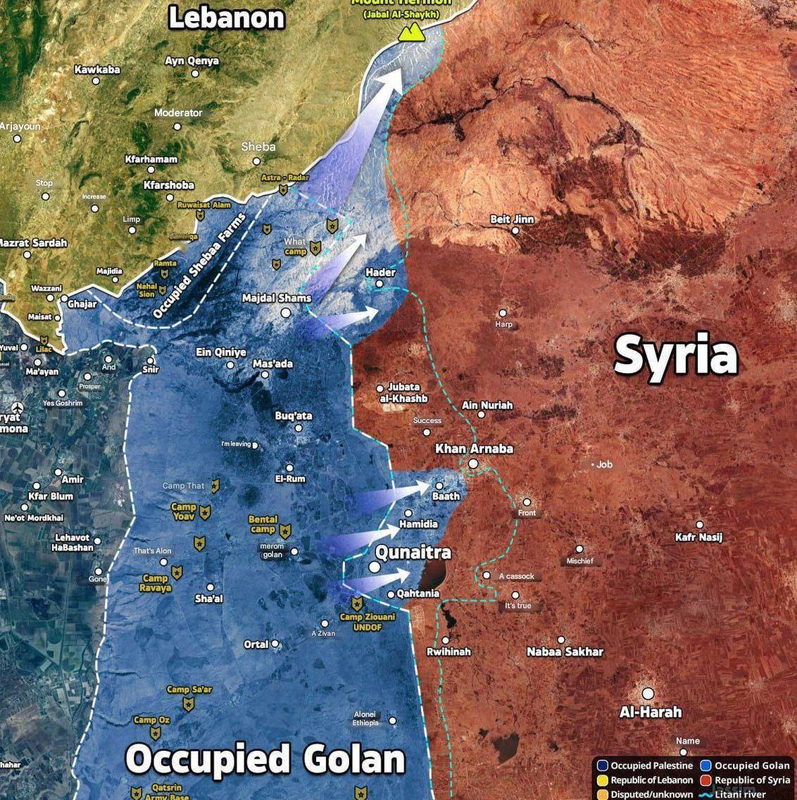 Причем СМИ пишут, что израильтяне вышли за пределы буферной зоны и атаковали населенные пункты Эль-Кунейтру, Эль-Баас, Эль-Хамидийя, а севернее - Хадр, важный для коммуникаций Ливана через сирийскую территорию. Израильская авиация усиленно бомбит цели на юге Сирии - в районе провинций Дараа и Эс-Сувейда.