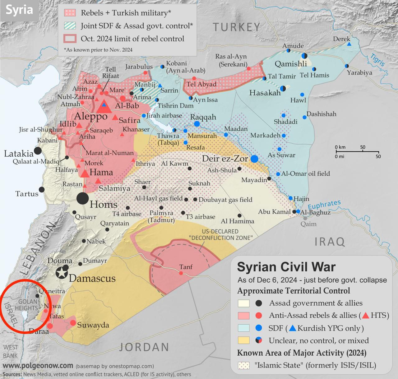 Пока протурецкие формирования пытаются взять под контроль северную и центральную части Сирии, вступая в бои с курдами, с юго-запада в страну вошли израильские войска. Как уже сообщали власти Израиля, они захватили буферную зону в ранее контролируемых Сирией районах Голанских высот. Западная часть этих высот контролируется Израилем еще с 1967 года.