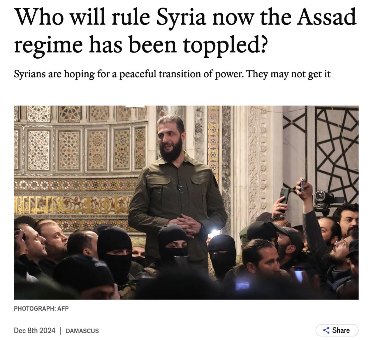 В то же время британский журнал The Economist считает, что именно 42-летний аль-Джулани является главным претендентом на управление Сирией. Он руководил наступлением повстанцев из Идлиба, которое привело к свержению Асада.