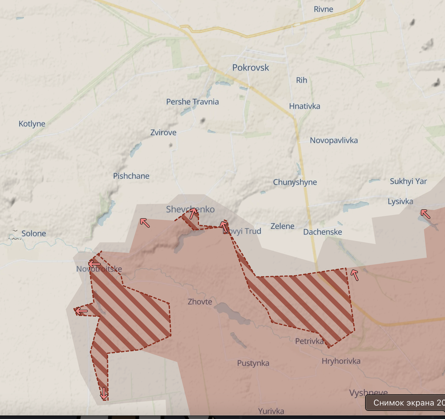 "Алекс" также пишет, что захват Шевченко создает угрозу охвата Покровска с запада и выхода РФ на трассу на Павлоград. Он отмечает, что с учетом рельефа дальнейшее движение РФ возможно севернее или северо-западнее Шевченко.