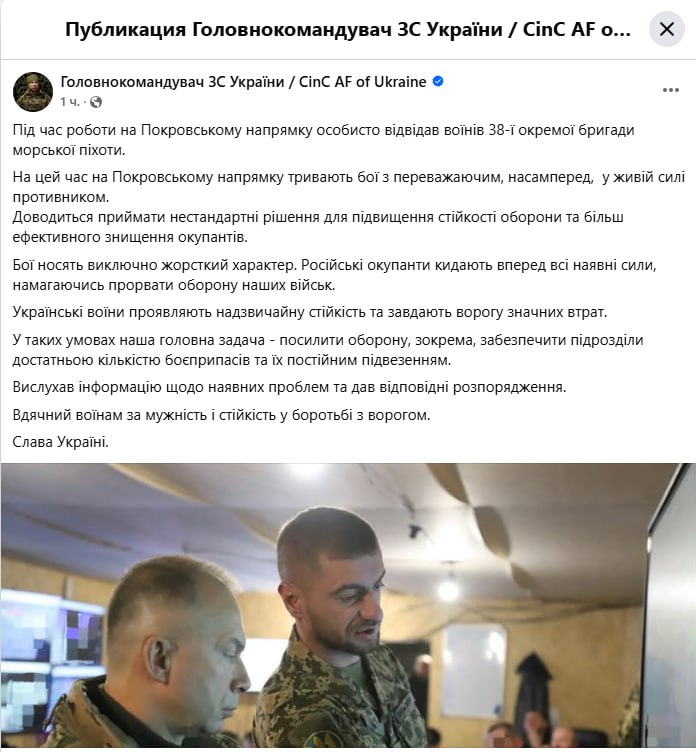 Главнокомандующий Вооруженных сил Украины Александр Сырский заявил, что на Покровском направлении бои носят "исключительно жесткий характер".