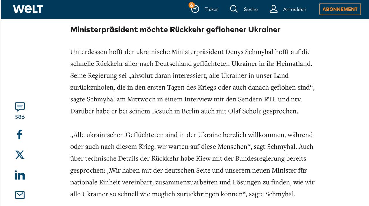 Die Welt пишет, что премьер Украины "надеется", что все беженцы вернутся из ФРГ. Эту тему он обсуждал с канцлером ФРГ Олафом Шольцем в Берлине.