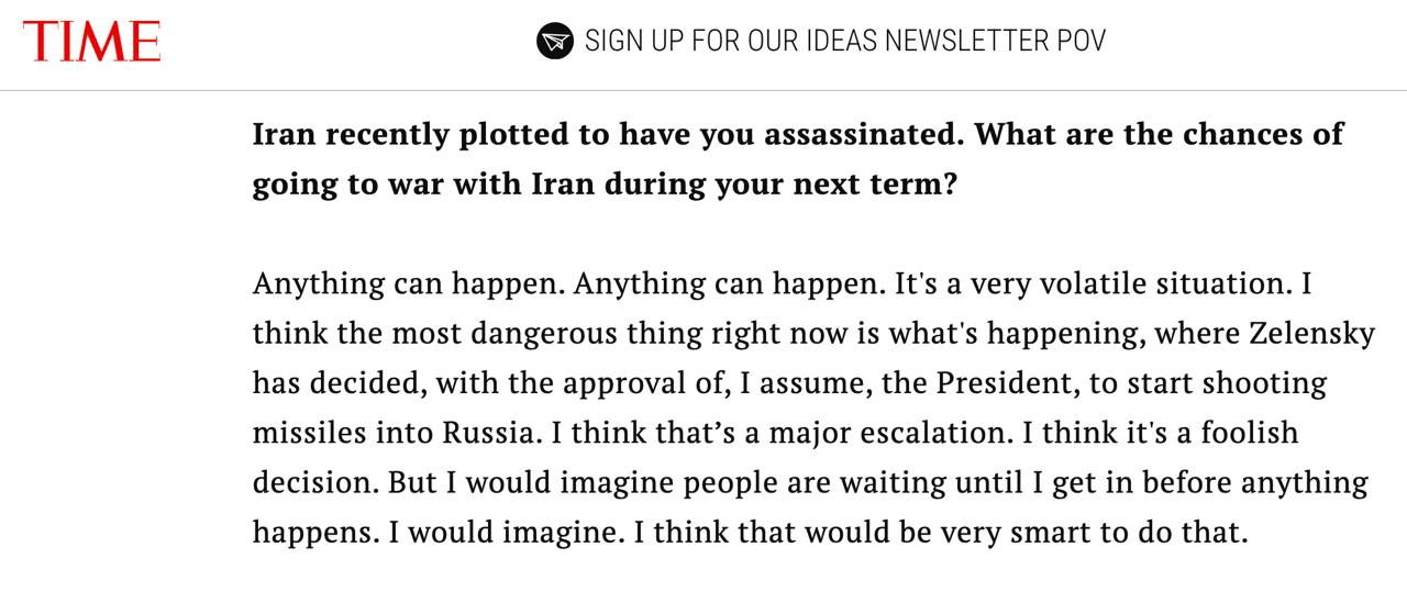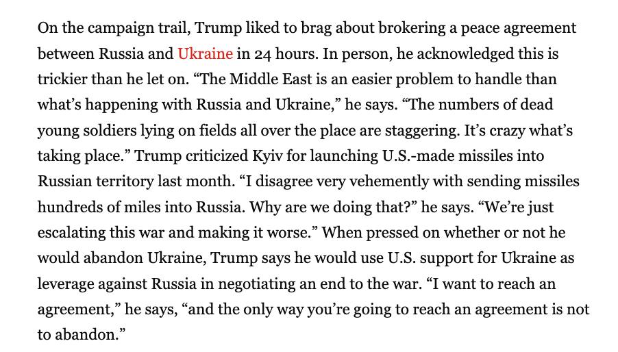 "Я категорически не согласен с отправкой ракет за сотни миль в Россию. Почему мы это делаем? Мы просто обостряем эту войну и усугубляем ее", - приводит издание слова избранного президента.