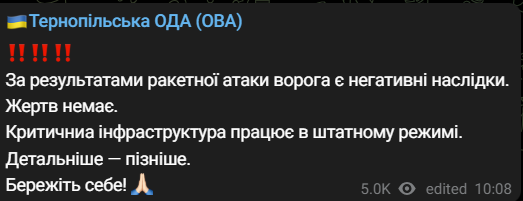 В Тернопольской области также "негативные последствия" после атаки, сообщает ОВА.