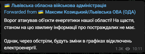 Во Львовской области были удары по объектам энергетики, сообщает ОВА.