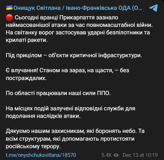 Ивано-Франковская область подверглась "самой массированной атаке за время полномасштабной войны", сообщает глава ОВА Светлана Онищук.