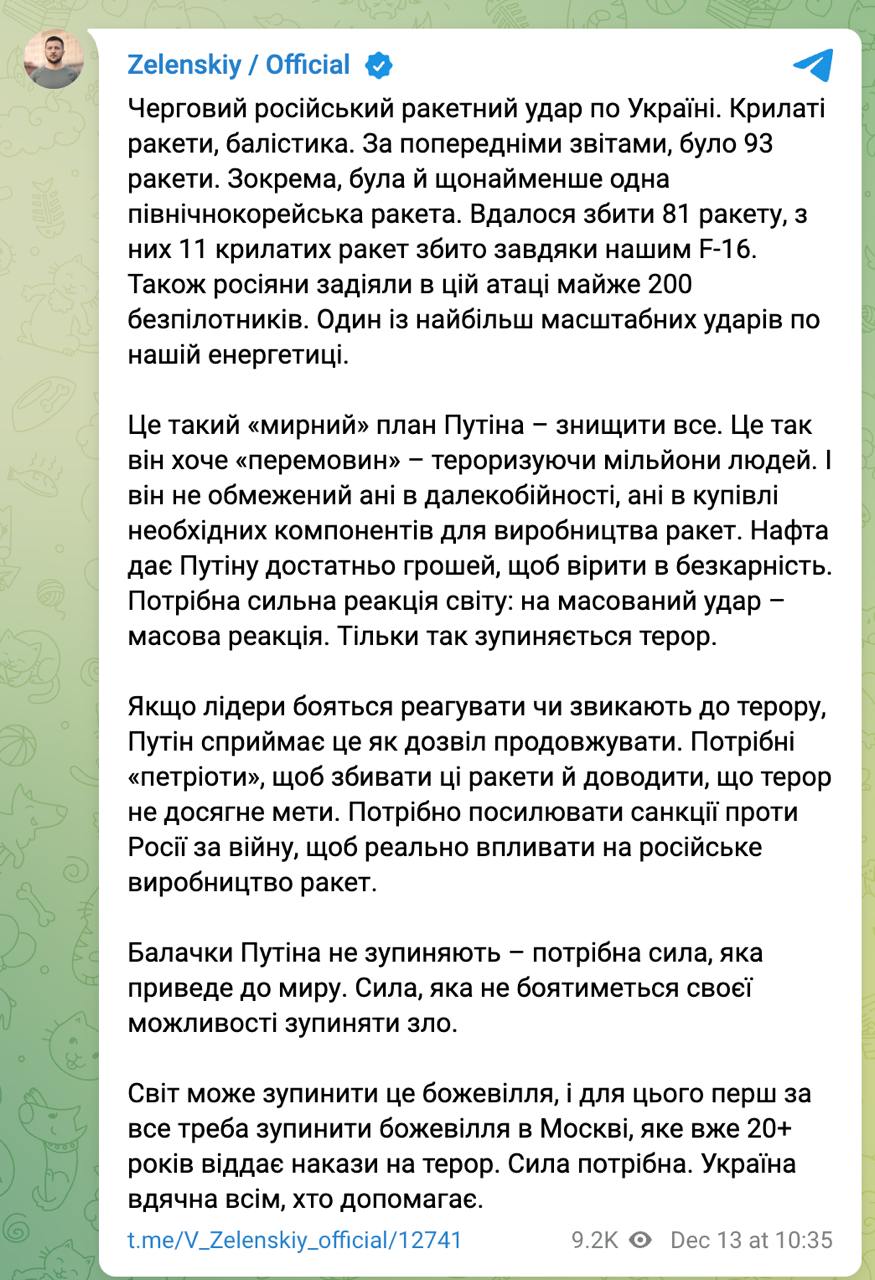 "Один из самых масштабных ударов по нашей энергетике. Это такой "мирный" план Путина – уничтожить все. Это так он хочет "переговоров" – терроризируя миллионы людей", - написал он.