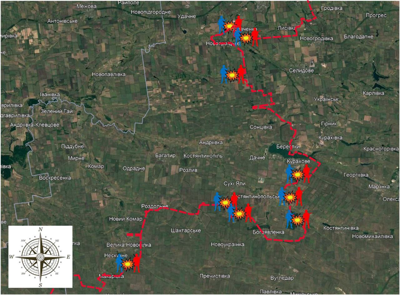 В то же время противник проводил штурмовые действия в районе юго-западнее Сторожевого, юго-западнее населенного пункта Сухие Ялы, южнее Константинопольского и юго-западнее населенного пункта Веселый Гай.
