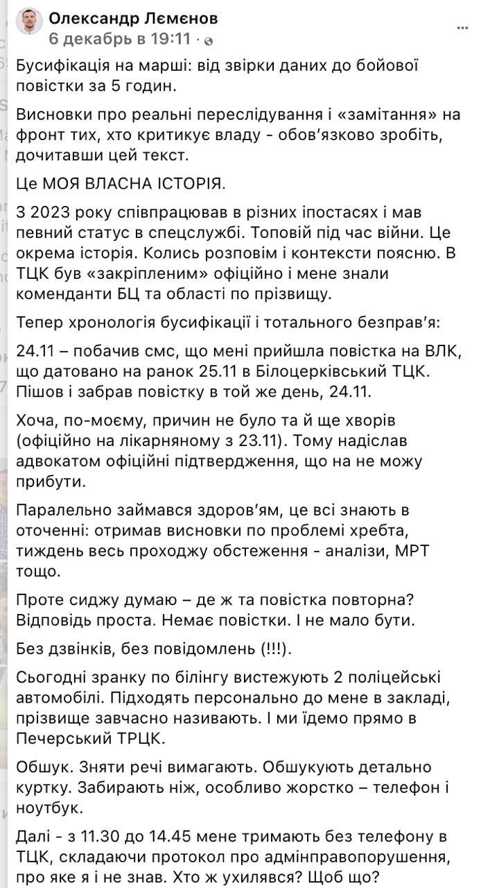 Однако "по причине болезни" на медкомиссию Леменов не явился (хотя лично приезжал днем ранее в военкомат за повесткой). После чего 6 декабря, по его словам, его задержали полицейские и доставили в Печерский ТЦК.