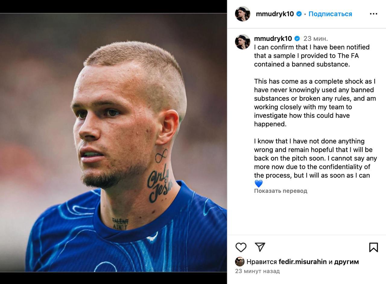 "Я могу подтвердить, что меня известили о том, что образец, который я предоставил ФА, содержал запрещенное вещество. Это стало полным шоком, поскольку я никогда сознательно не употреблял никаких запрещенных веществ и не нарушал никаких правил и тесно сотрудничаю со своей командой. , чтобы расследовать, как это могло произойти", – написал Мудрик.