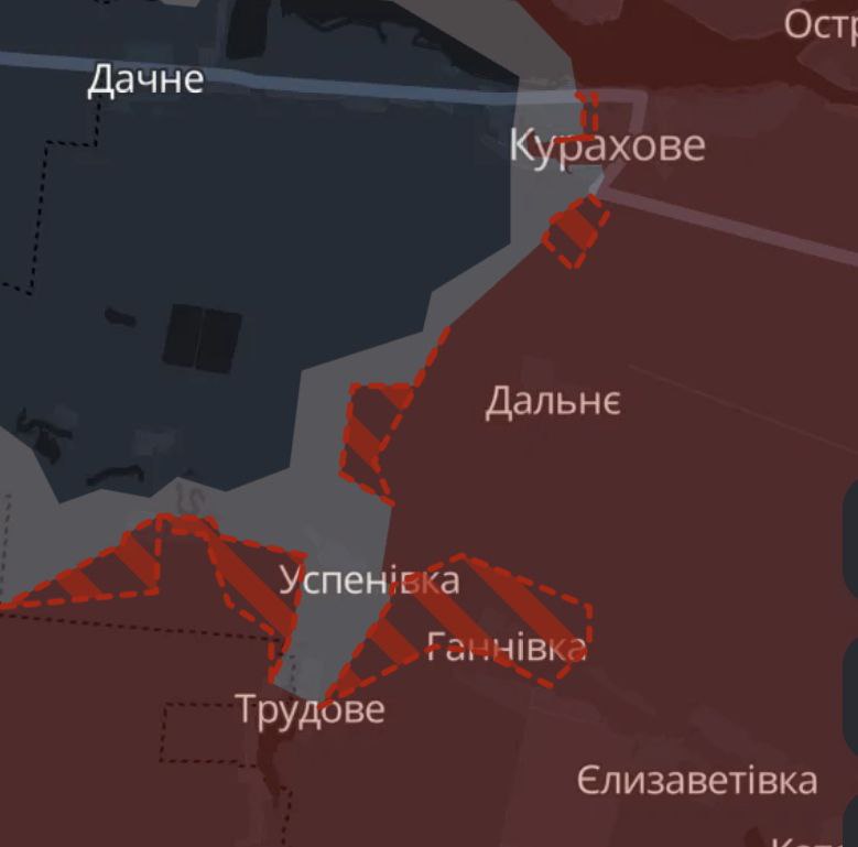 Западнее россияне, как видно по карте Deep State, ещё ближе подошли к трассе на Курахово с запада. Они уже менее чем в двух километрах от ключевого села Константинополь.