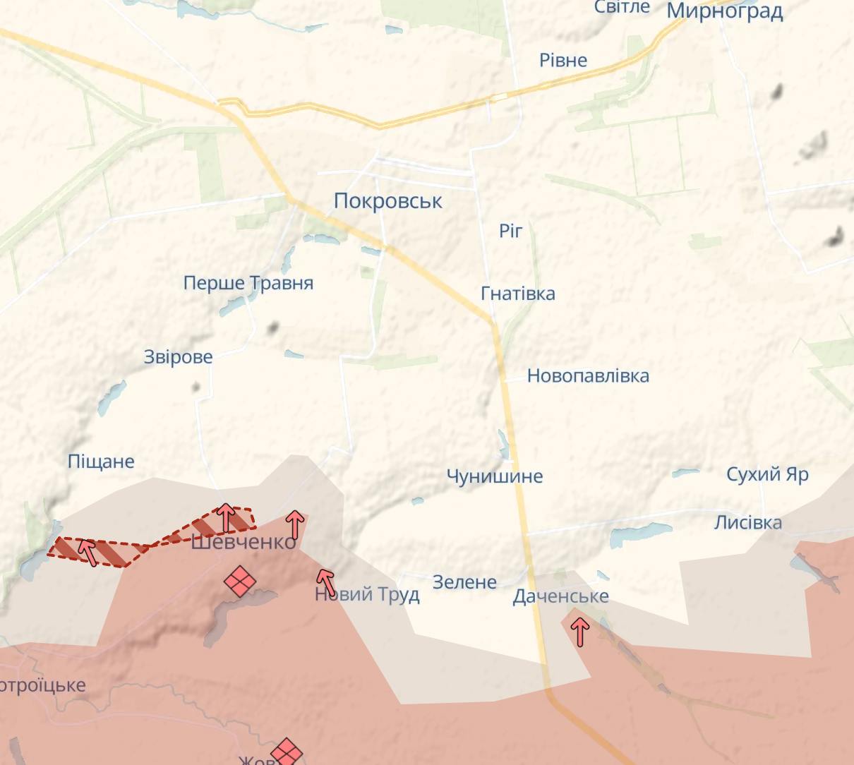 Севернее россияне снова продвинулись под Покровском, где накануне контратаковали ВСУ. Указана потеря территорий в Шевченко и южнее Песчаного, откуда на выходных шла украинская контратака.