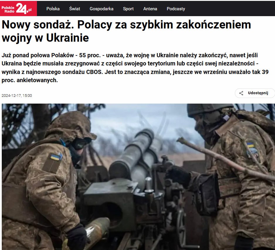 Более 50% поляков поддерживают быстрое завершение войны даже в случае потерь Украиной территорий.