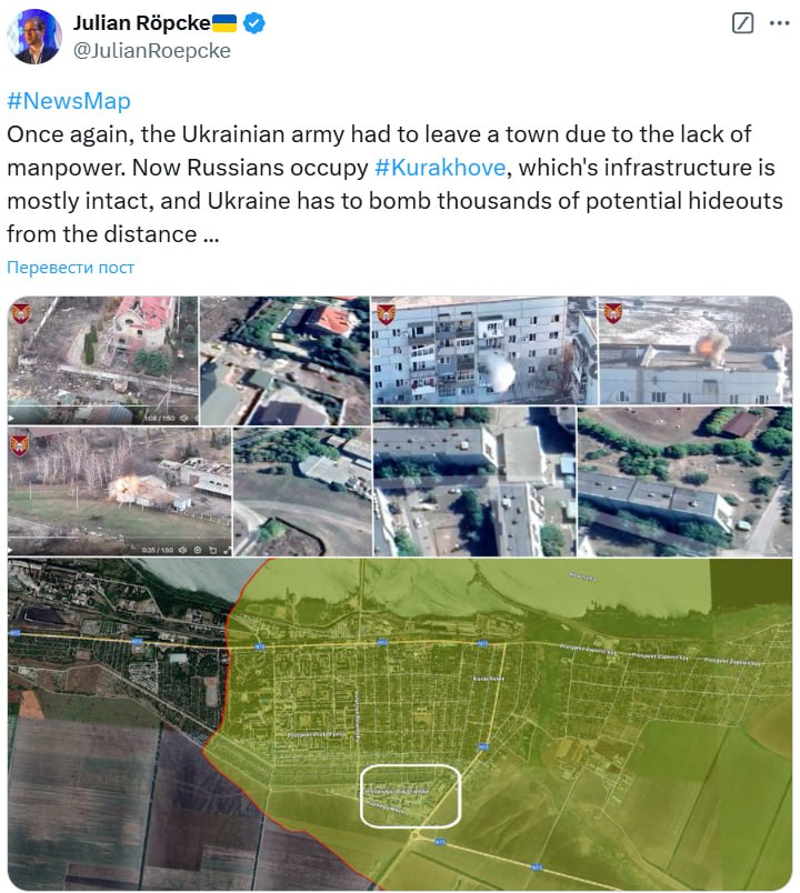 "Украинской армии снова пришлось покинуть город из-за нехватки людей. Теперь россияне оккупируют Курахово, инфраструктура которого в основном не тронута, а Украине приходится бомбить тысячи потенциальных укрытий с расстояния", – сообщил Рёпке.
