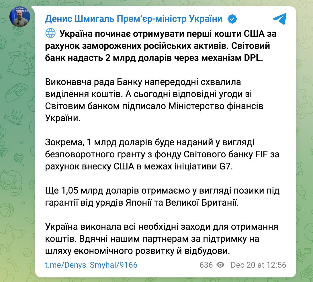 Украина начинает получать первые деньги от США за счет замороженных российских активов - Шмыгаль