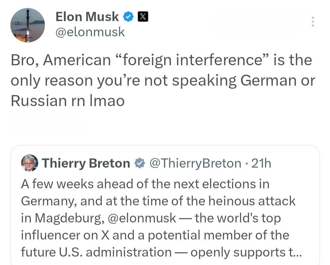 "За несколько недель до новых выборов в Германии и во время отвратительного нападения на Магдебург, Илон Маск, самый влиятельный человек платформы X и потенциальный член будущей администрации США, открыто поддержал крайне правую партию АдГ. Разве это - не классическое проявление иностранного вмешательства? Мы должны положить конец двойным стандартам", - написал Бретон в Х.