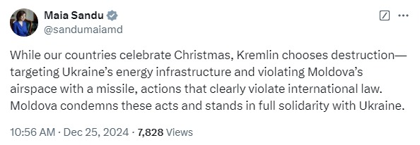 Пока наши страны празднуют Рождество, Кремль выбирает разрушение — нацеливается на энергетическую инфраструктуру Украины и нарушает воздушное пространство Молдовы ракетой, действия, которые явно нарушают международное право. Молдова осуждает эти действия и полностью солидарна с Украиной", - написала Санду в соцсети Х.
