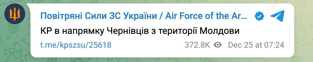 О залете ракеты из Молдовы сообщали и Воздушные силы ВСУ.