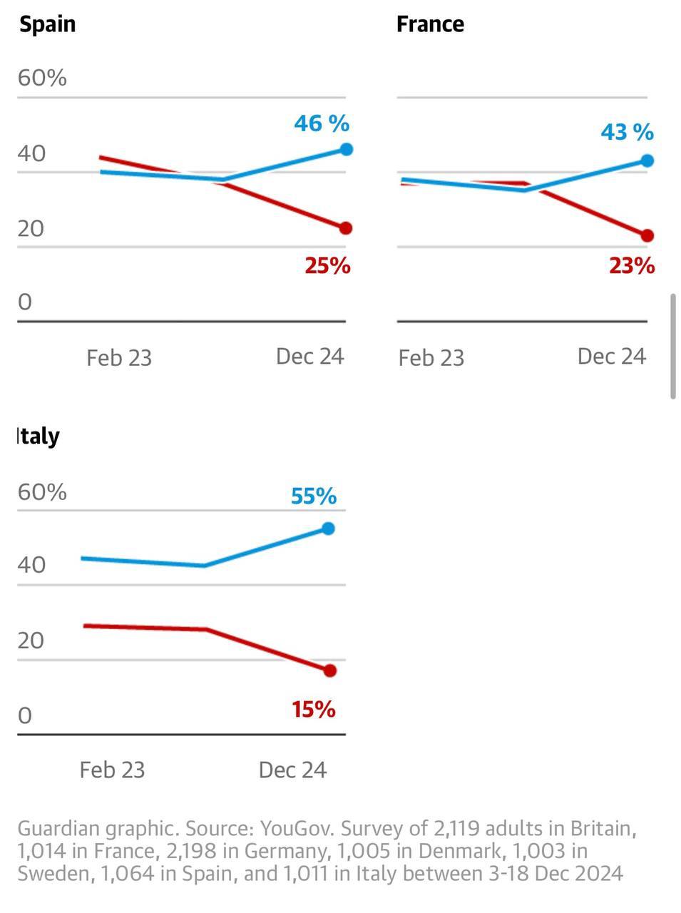 О настроениях европейского населения на этот счет красноречиво пишет британская газета The Guardian со ссылкой на опрос YouGov. Ориентация на победу Киева в этой войне упала во всех семи странах, где опрашивали людей: Франция, Германия, Италия, Испания, Швеция, Дания и Великобритания.
