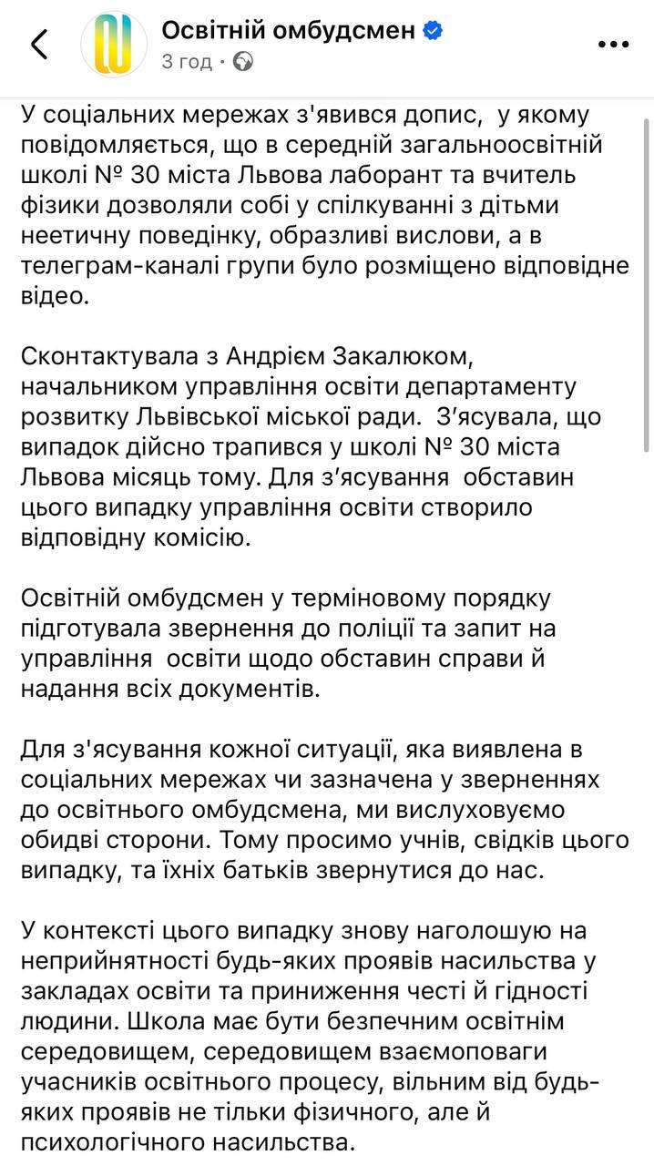 Паблики сообщали, что с такими словами обратились лаборант и учитель физики к ученикам львовской школы №30.
