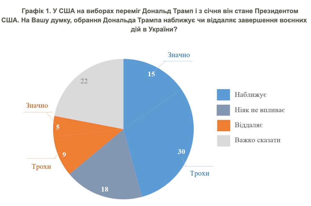 Социологи спросили, победа Трампа приближает или удаляет мир в Украине. Довольно твердую уверенность в том, что мир стал ближе, высказали 15% опрошенных, а 30% полагают, что мир становится лишь немного ближе. В том, что мир, напротив, становится более отдаленным, уверены 14%. Остальные 40% либо считают, что ничего не изменится, либо не смогли определиться со своим мнением.