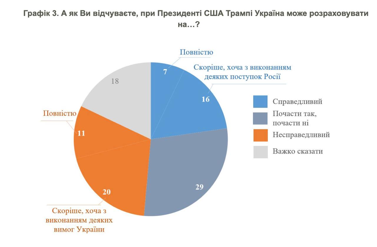 Приближение мира не означает, что он может быть справедливым для Украины, отметили авторы исследования. Поэтому ои задали соответствующий вопрос респондентам: может рассчитывать Украина на справедливый мир при президенте Трампе? Только 7% убеждены, что мир может быть полностью справедливым для Украины. 11% считают, что мир будет полностью несправедлив для Украины. Большинство же граждан  находятся между этими крайними мнениями. 23% полагают, что мир будет преимущественно или полностью справедливым для Украины, а 31% - что будет преимущественно или полностью несправедливым. Еще 29% считают, что будут и выполнение требований Украины, и уступки России. 18% не смогли определиться со своим мнением.