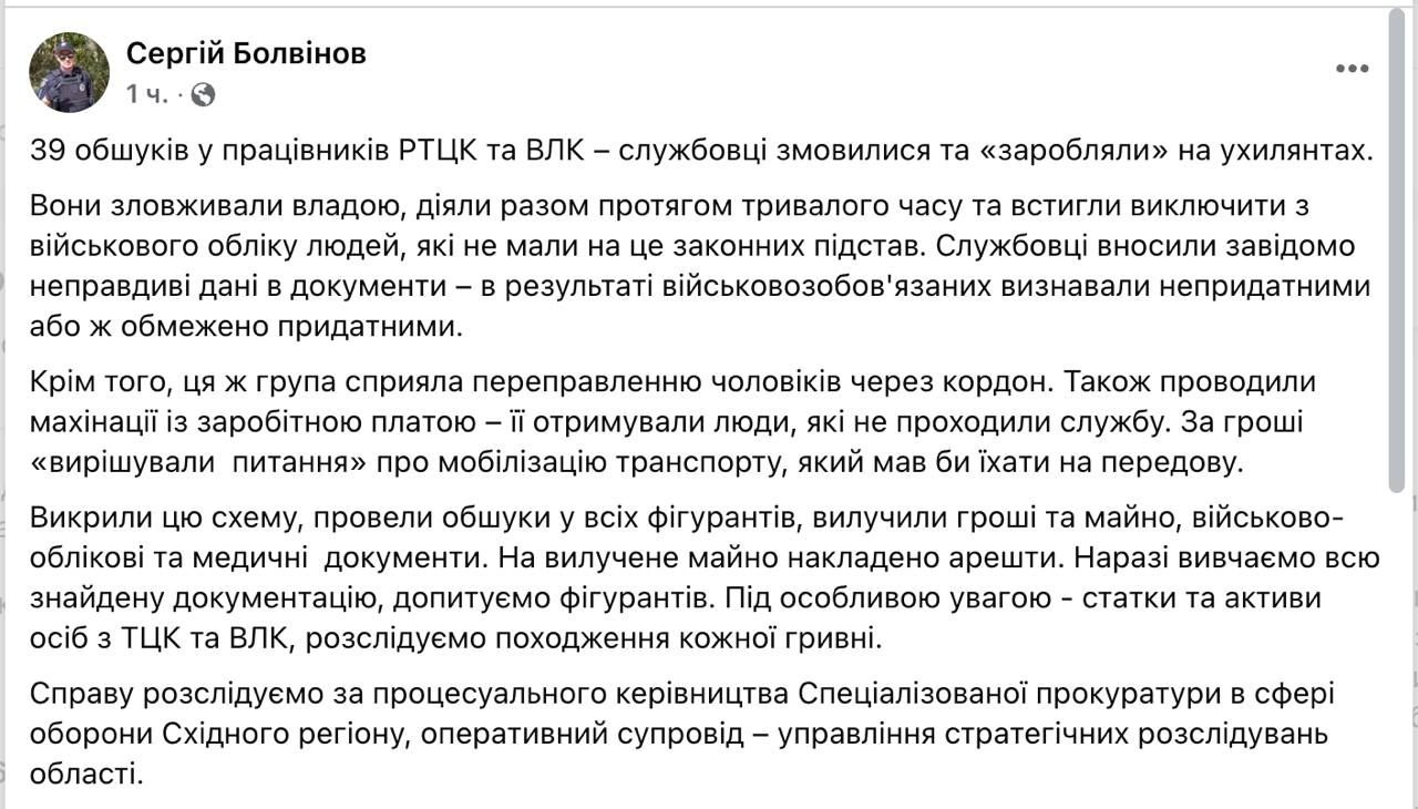 В Харьковской области проходит сразу 39 обысков у работников ТЦК и СП и военных медкомиссий, которые зарабатывали деньги на схемах уклонения от мобилизации.