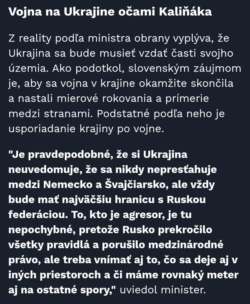 "Реальность показывает, что Украине придется отказаться от части своей территории", - цитирует Роберта Калинка местный телеканал ТА3.
