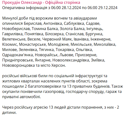 08:00 За прошедшие сутки в Херсонской области из-за российских обстрелов 13 человек получили ранения, из них - 2 ребенка, сообщает глава ОВА Александр Прокудин.