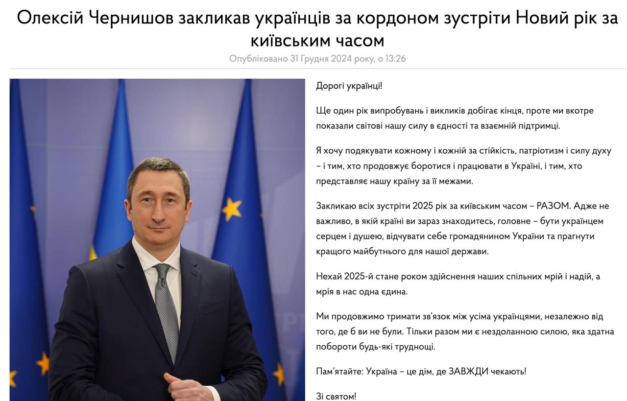 Глава новосозданного Министерства национального единства Алексей Чернышов призвал украинцев за границей встретить Новый год по киевскому времени.