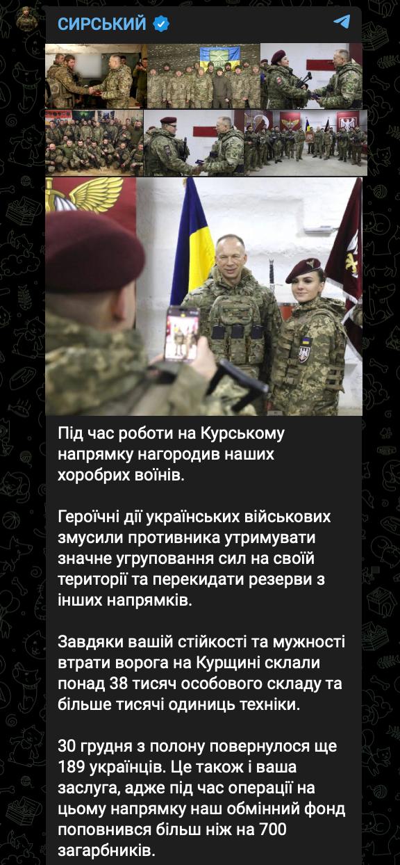 18.00 Сырский сообщил, что приехал в Курскую область РФ. В телеграм-канале у главкома ВСУ появилось сообщение, что он прибыл на Курское направление, где раздал награды бойцам.