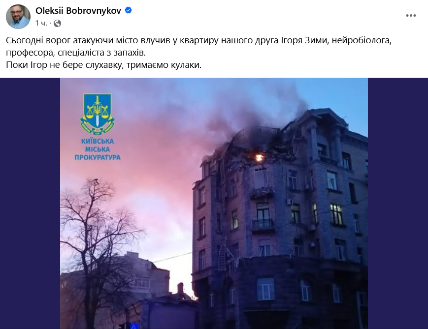 18.58 Нейробиолог Игорь Зима, живший в доме в центре Киева, на который упал сбитый дрон, погиб вместе с семьей.
