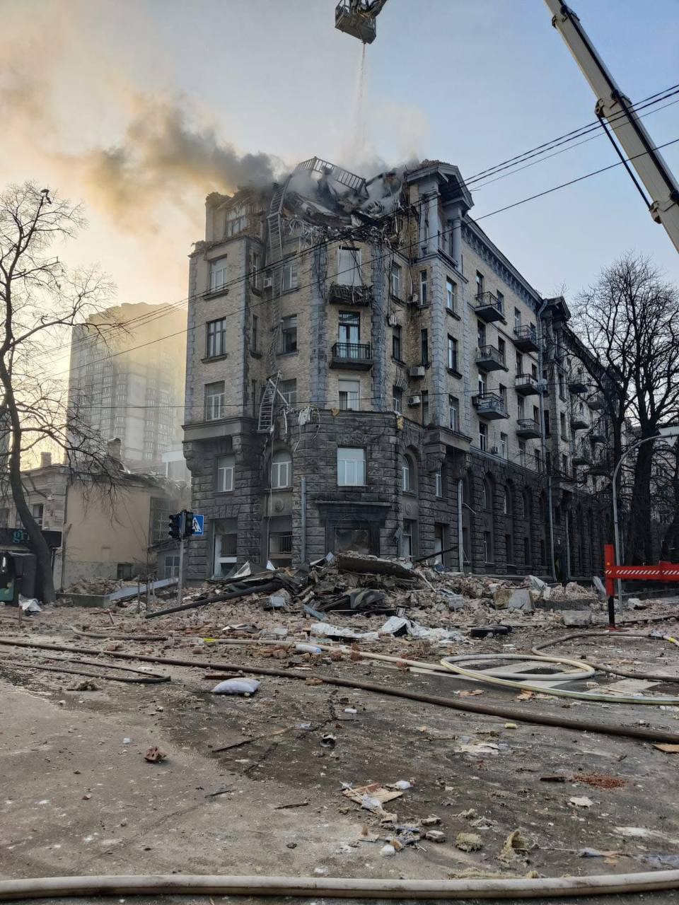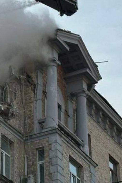 13.59 Вид на "дом Совнаркома" в центре Киева, разрушенный после сегодняшней атаки беспилотников на столицу.