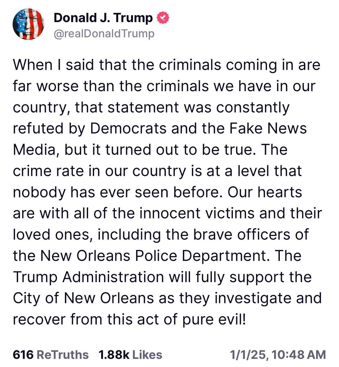 Из поста Трампа выходит, что террорист приехал в США и получил гражданство, хотя представители властей города, штата Луизиана и ФБР заявляют, что Джаббар родился в США и имел гражданство страны по рождению.