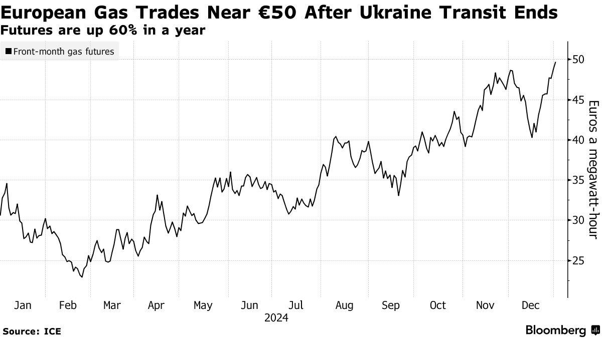 Цены на газ в Европе достигли самого высокого уровня с октября 2023 года. Это произошло после прекращения транзита российского газа через Украину, на фоне похолодания в Европе и после остановки норвежского завода по производству сжиженного природного газа (СПГ) из-за отказа компрессора.
