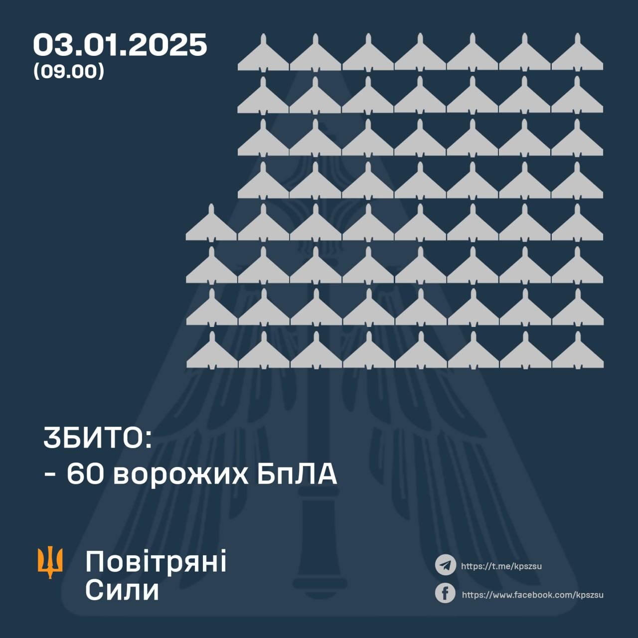 09:18 Воздушные силы сообщают, что этой ночью сбили 60 "Шахедов" из 93. Еще 26 "не достигли цели, локационно утрачены".