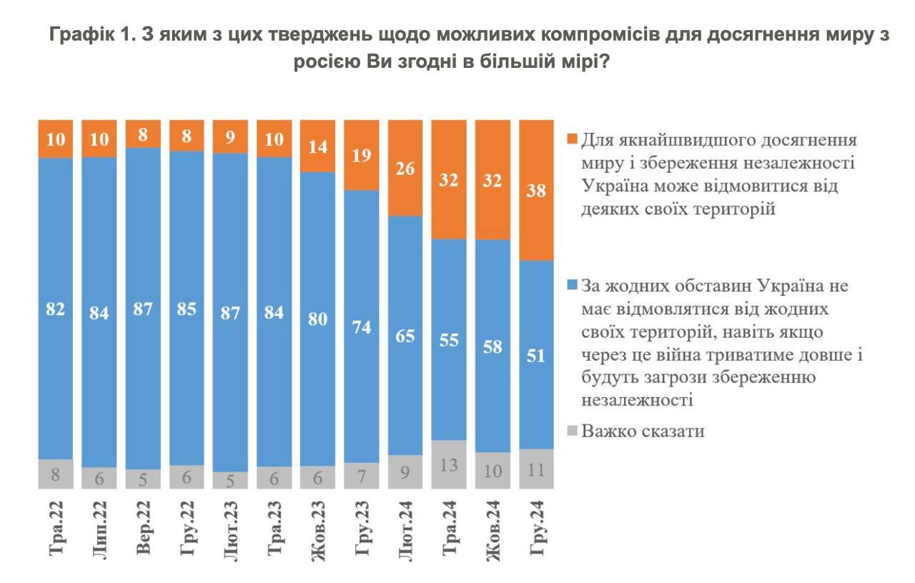 За минувший год вдвое увеличилось количество украинцев, готовых к отказу от части территорий ради мира и сохранения независимости.