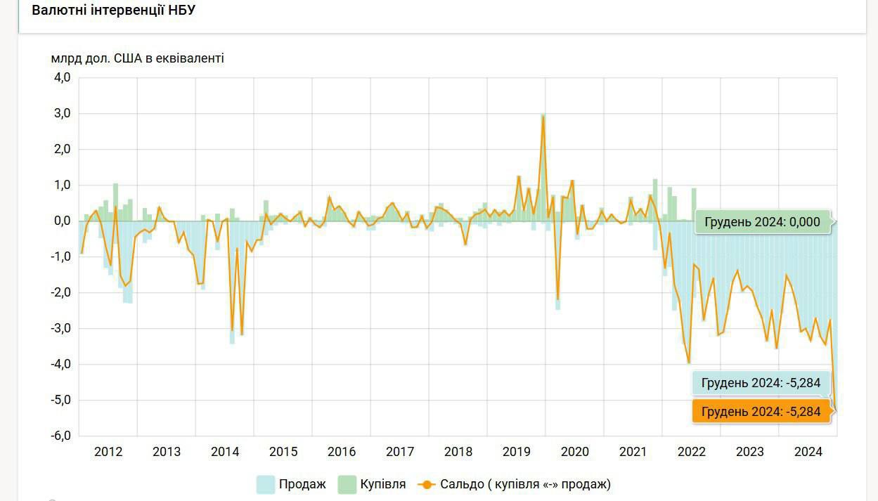 В новом отчете регулятора сообщается, что в декабре 2024 года он выбросил на межбанк для поддержания стабильности гривны сразу $5,3 млрд грн.