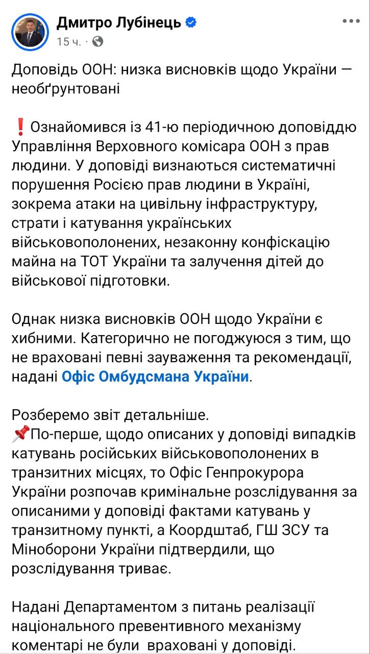 Уполномоченный Верховной Рады Украины по правам человека Дмитрий Лубинец раскритиковал доклад ООН о нарушении прав человека в Украине за упоминание пыток в отношении российских военнопленных.