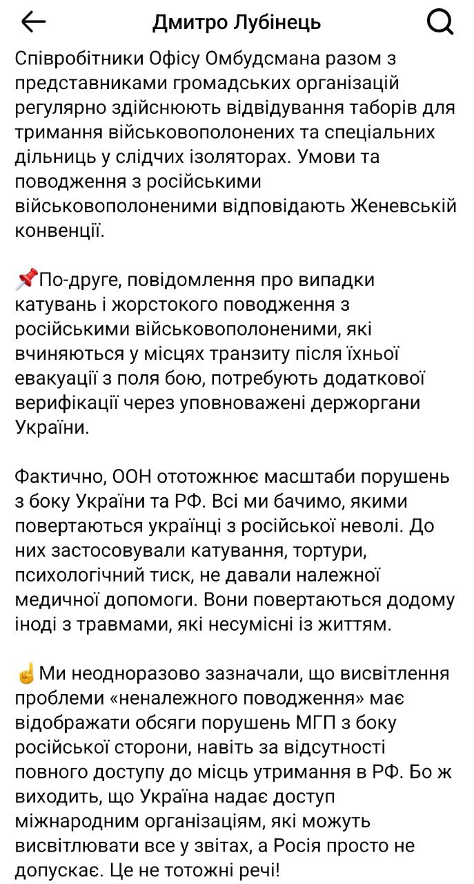 Лубинец считает, что сообщения о случаях жестокого обращения с военнопленными, "нуждаются в дополнительной верификации через уполномоченные госорганы Украины".