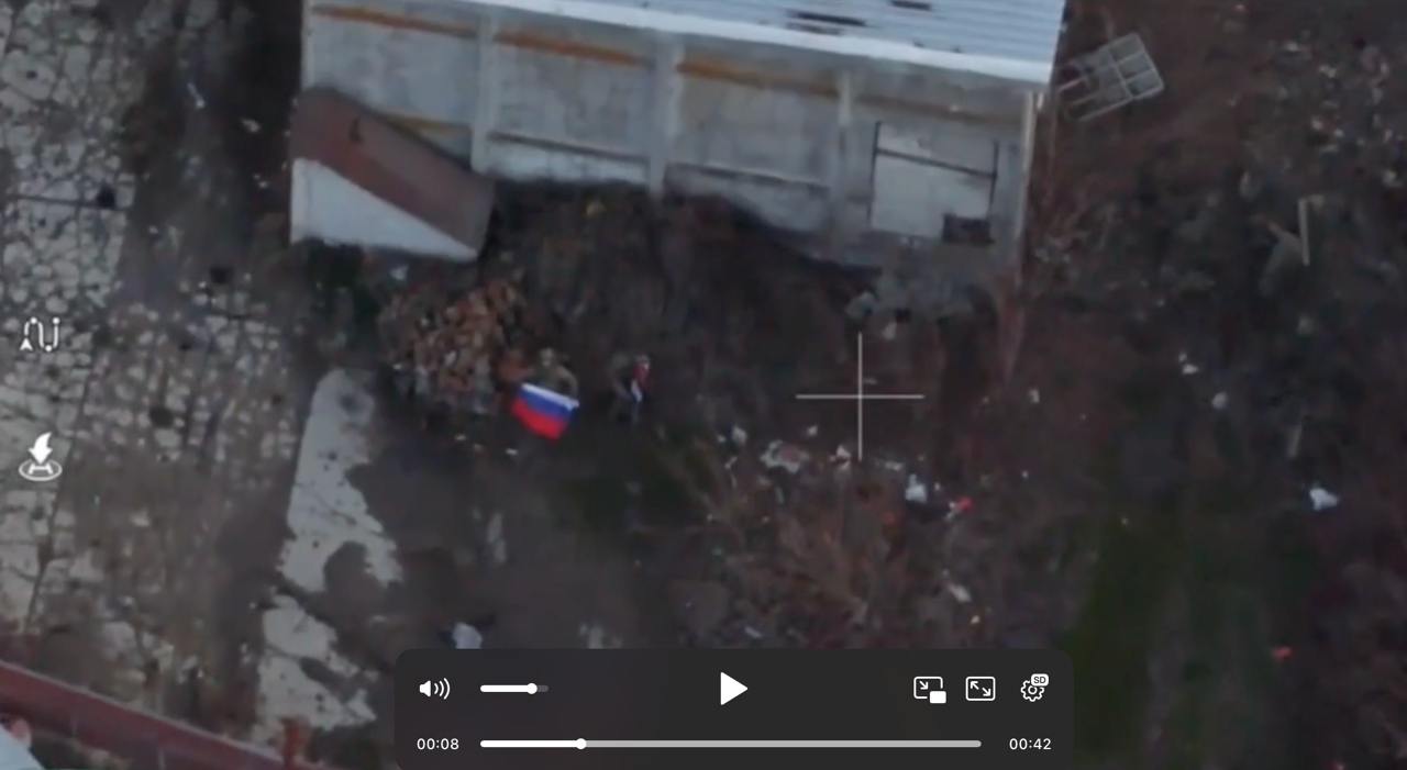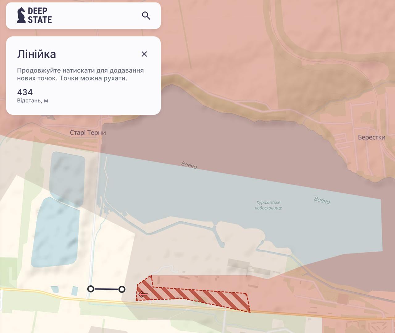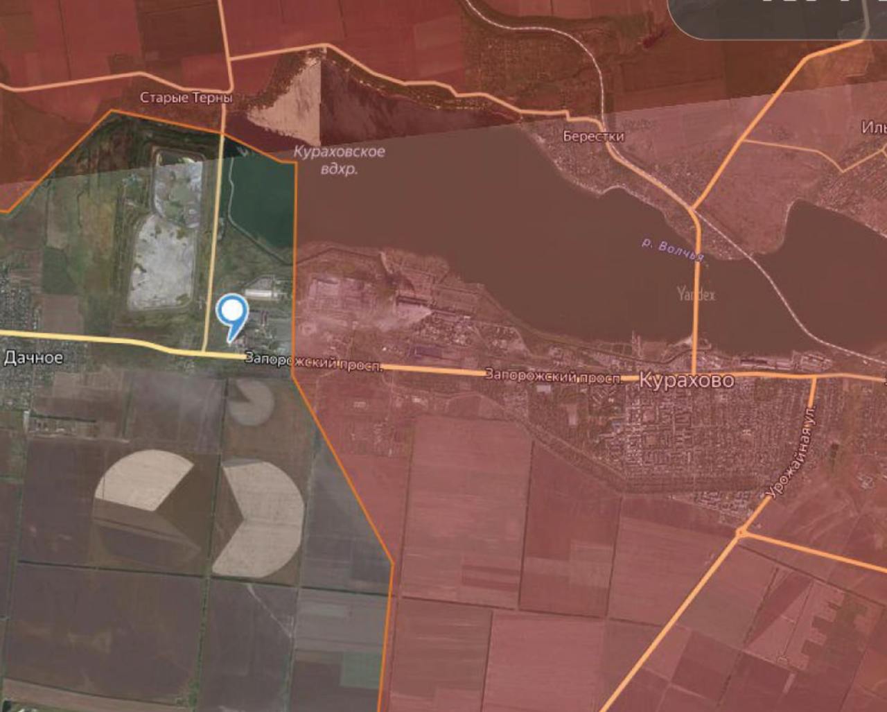 Российские паблики заявляют, что их войска установили флаг на западной окраине Курахово. Они публикуют кадры с геопривязкой, утверждая, что это местность к югу от Старых Тернов.