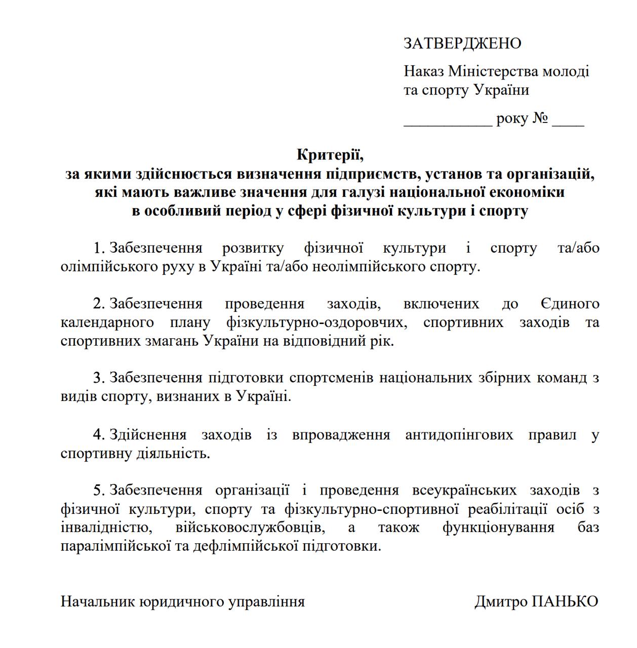 Министерство молодежи и спорта утвердило новые критерии, согласно которым осуществляется определение предприятий, учреждений и организаций, имеющих важное значение для отрасли национальной экономики в особый период в сфере физической культуры и спорта.