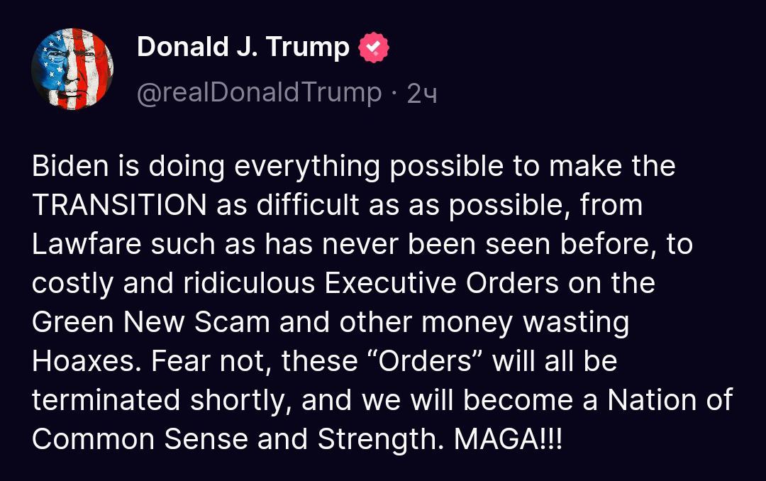 "Законодательство, какого ещё никогда не было, дорогостоящие и нелепые указы о новом "зелёном" мошенничестве и другие дорогостоящие пустые мистификации. Не бойтесь, все эти "приказы" скоро будут отменены, и мы станем Нацией Здравого смысла и силы", – пишет Трамп, завершая публикацию аббревиатурой своего политического лозунга: "Сделаем Америку снова великой!"